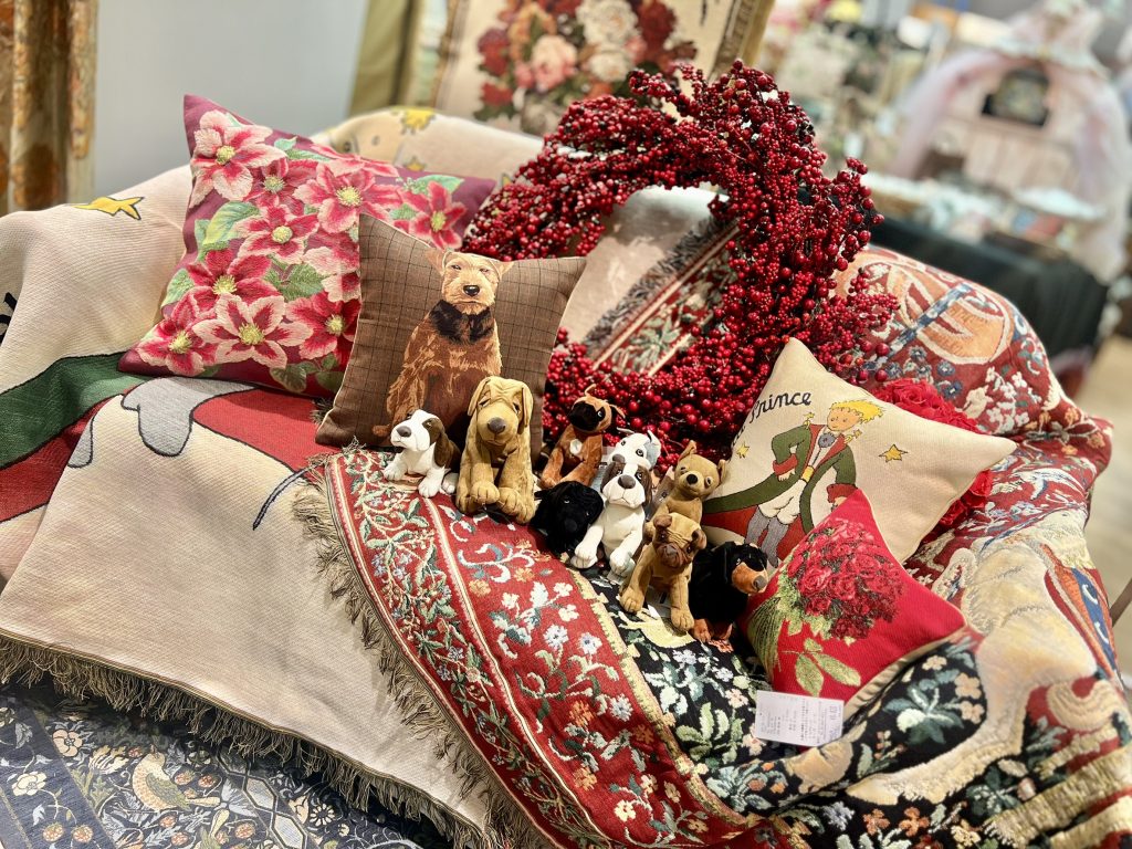フランスやベルギーから取り寄せた華やかなクッションや、