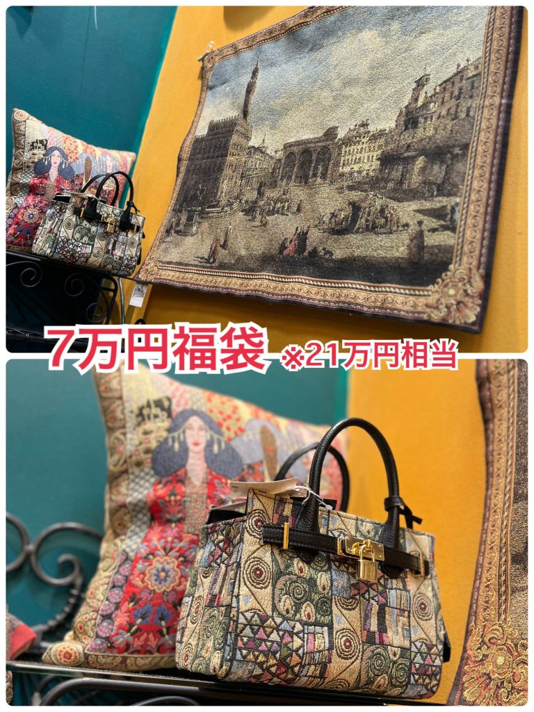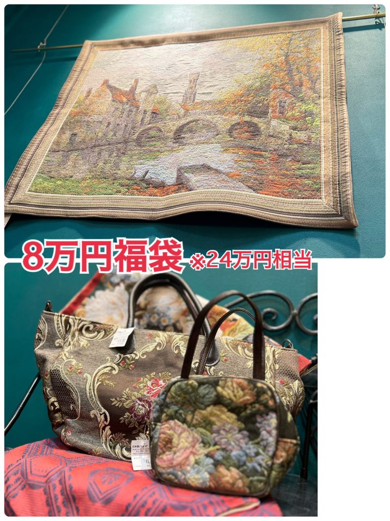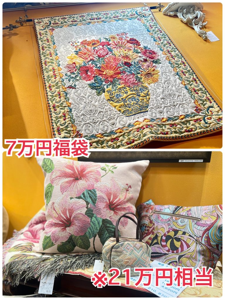景色のタペストリーと、エレガントな花のクッション。赤が印象的なテーブルランナーにバッグがついた24万円相当の福袋です。